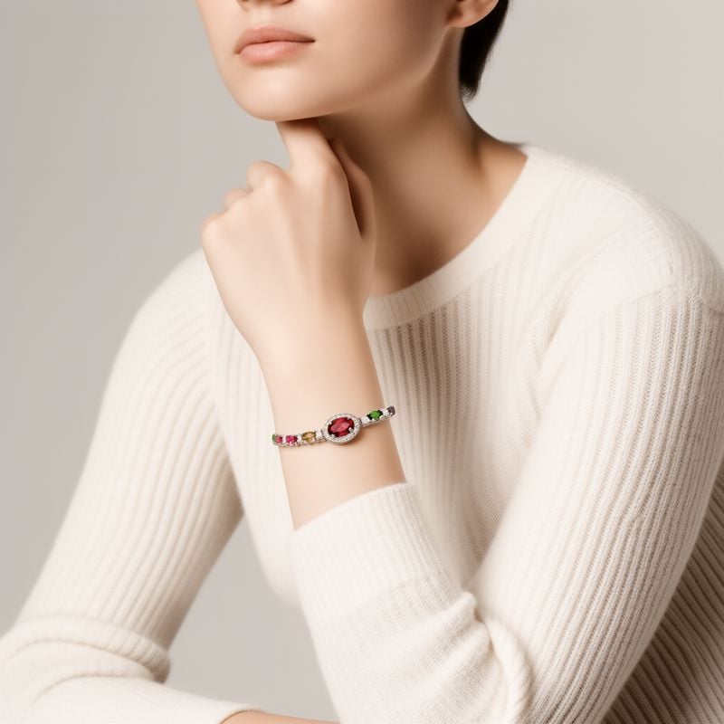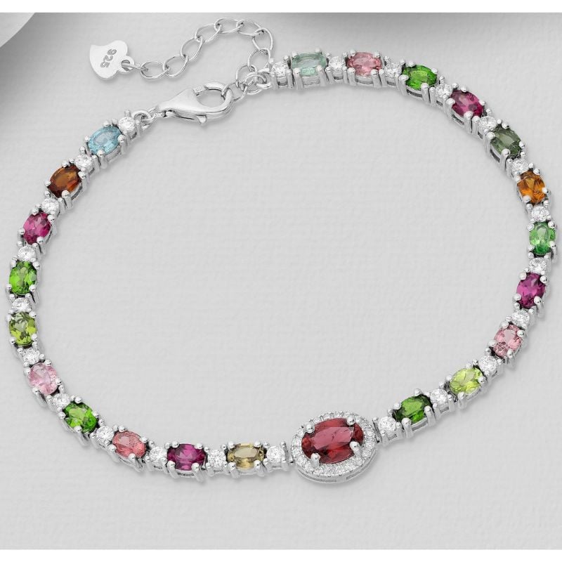 Designul sofisticat îmbină armonios turmalina multicoloră fațetată, ale cărei nuanțe vibrante creează un efect vizual unic, cu diamante simulate cubic zirconia albe, strălucitoare.
