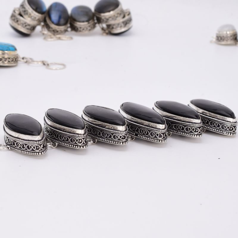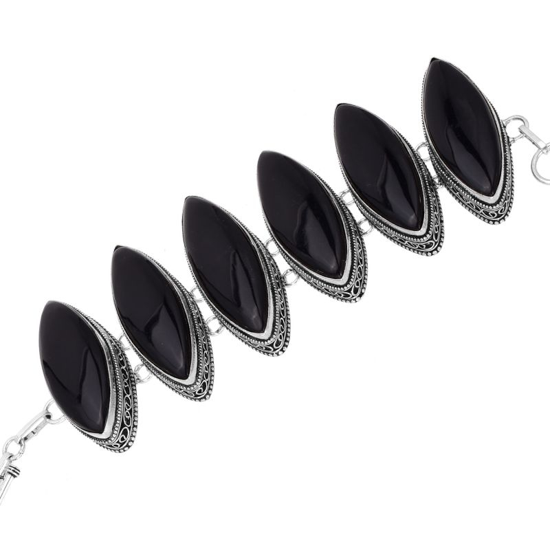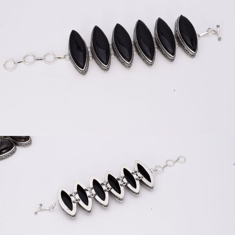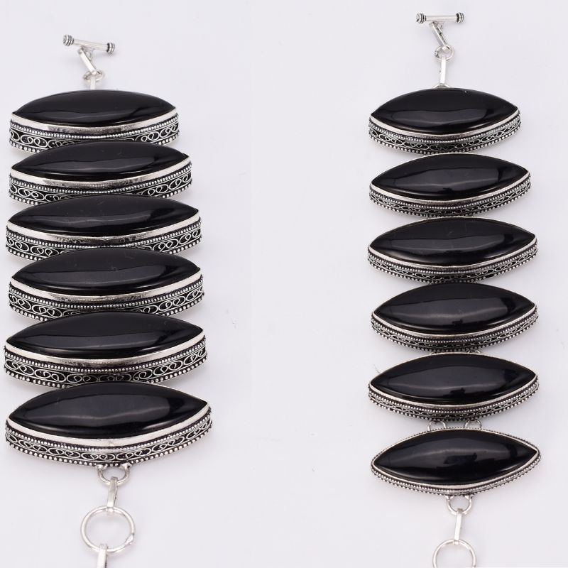 Puternică, elegantă și plină de caracter – această brățară este o declarație de stil și forță interioară! Realizată din argint 925 masiv piesa impresionează prin designul echilibrat, în care se regăsesc 6 pietre de onix natural, șlefuite în formă marquise, o formă clasică ce alungește vizual silueta mâinii.