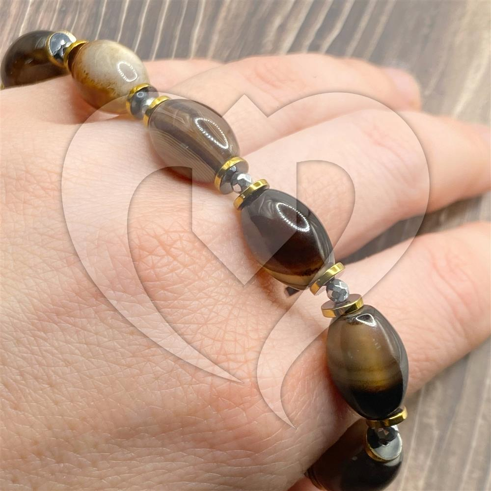 Elementul central agatul, o piatră cu vibrații de stabilitate, conectare la pământ și calm interior. Accentele finale sunt oferite de hematit, care adaugă o strălucire metalică rafinată. Reflexele aurii dau o notă de lux discret, păstrând în același timp sobrietatea compoziției.