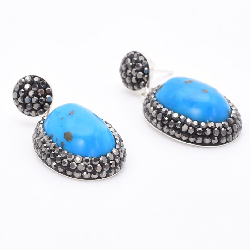 Turcoazul, cunoscut pentru nuanțele sale vibrante de albastru-verde și pentru energia sa protectoare, este piatra centrală a acestor cercei. Hematitul, cu luciul său închis și sobru, adaugă un contrast subtil, oferind profunzime și eleganță întregului ansamblu.