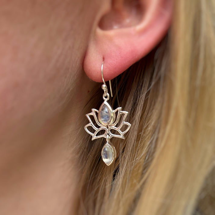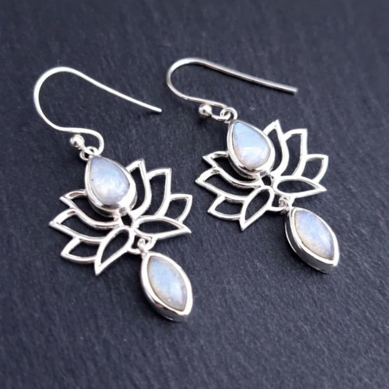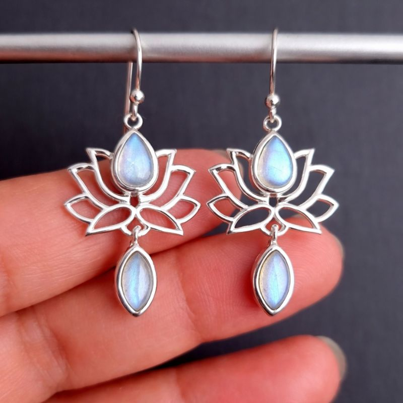 Eleganți și simbolici, acești cercei din argint înfățișează Floarea de Lotus – simbol al purității, feminității și echilibrului interior. Piatra lunii, cu reflexiile sale fine și lăptoase, adaugă o notă delicată și misterioasă, fiind asociată cu intuiția, armonia emoțională și energia feminină.