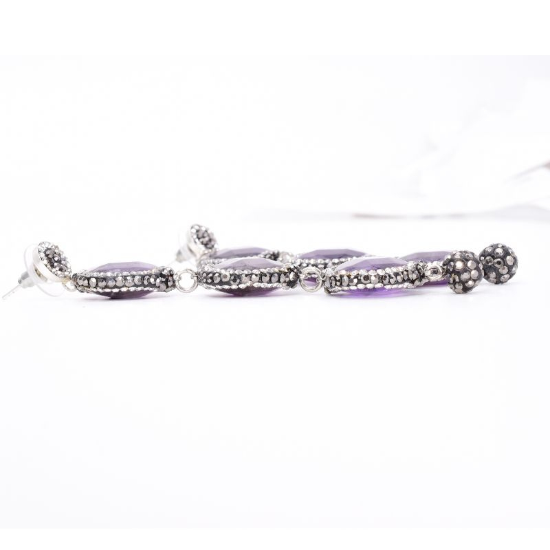 Pietrele de ametist fațetat, dispuse vertical, conferă un efect dramatic și sofisticat piesei. Fiecare gemă de cuarț purpuriu este perfect încadrată de hematit și cubic zirconia, într-un contrast subtil, care evidențiază nuanțele regale ale ametistului si creează un joc de lumini unic.