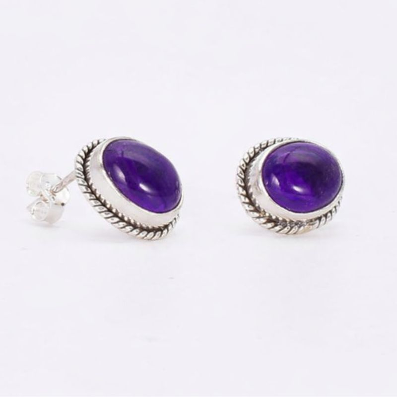 Cercei argint cu pietre ametist natural cabochon, pe ureche, realizați manual în India.