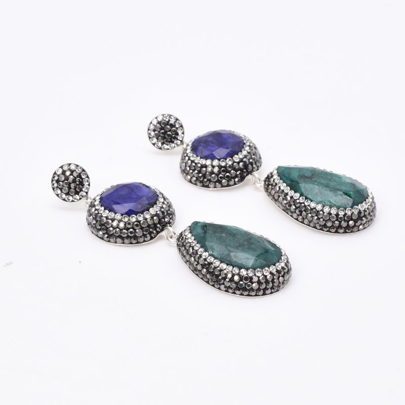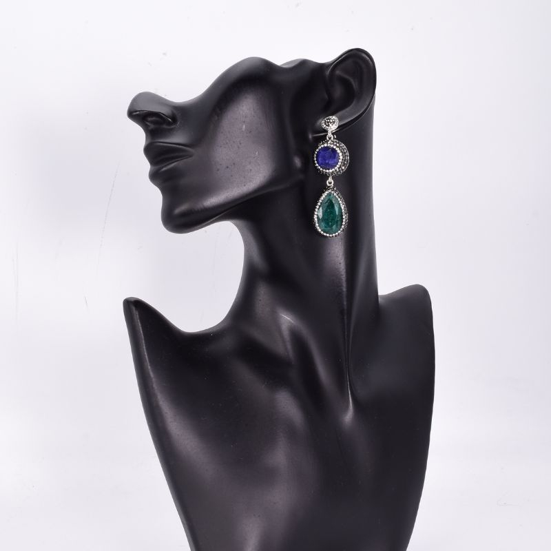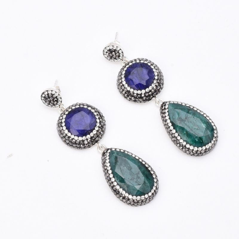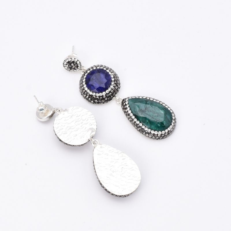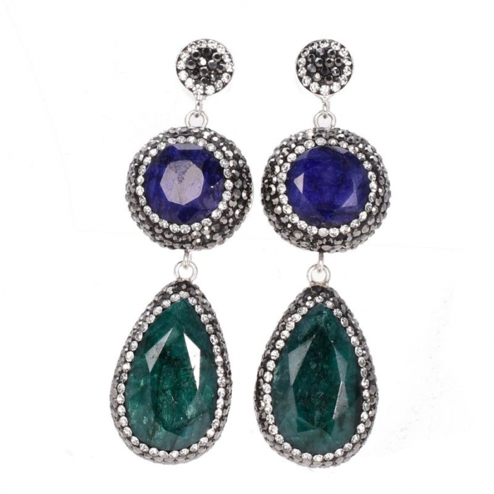 - Cercei din argint in stil otoman cu pietre naturale smarald, safir, hematit si pietricele de sinteza cubic zirconia albe.