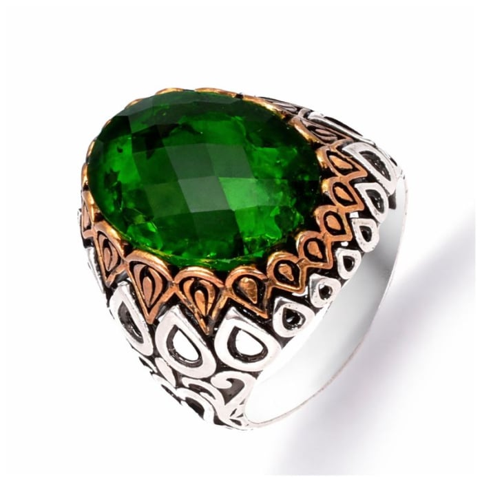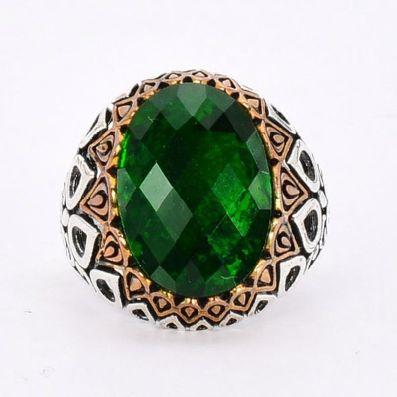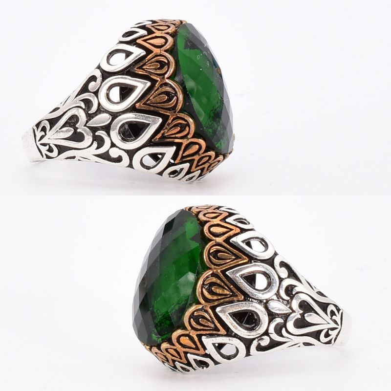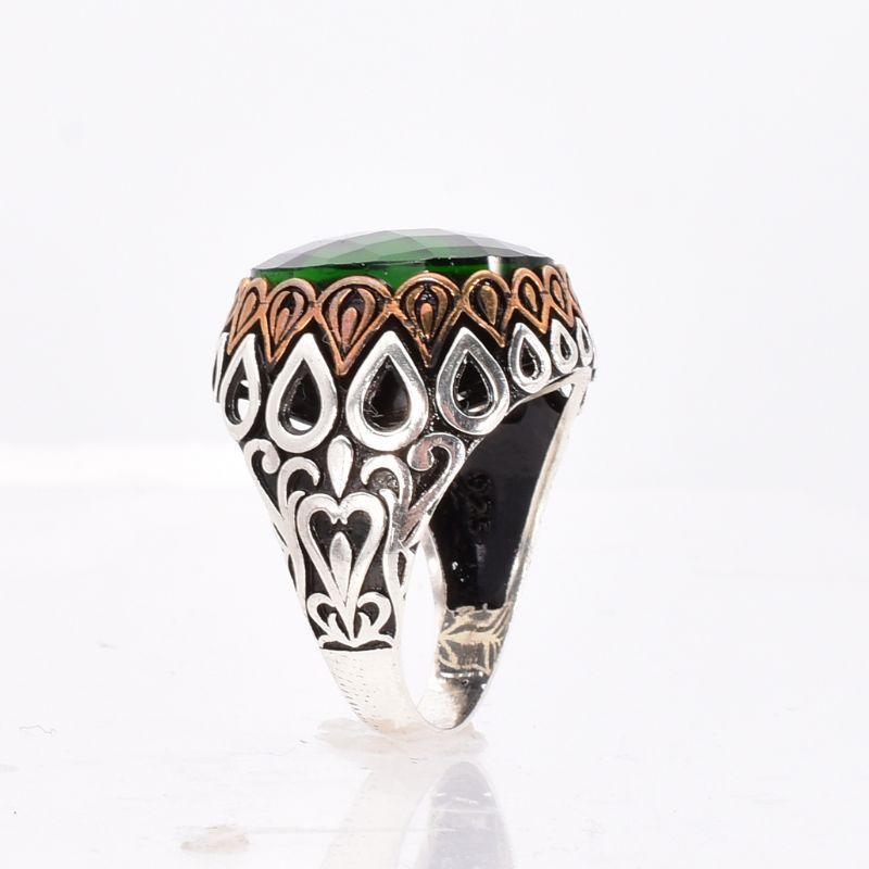 Inel bărbați din argint 925, realizat în stil otoman, cu piatra crom diopsid fațetat, oval și elemente din bronz.