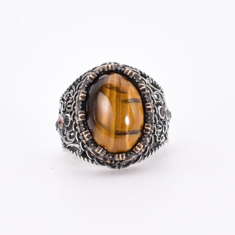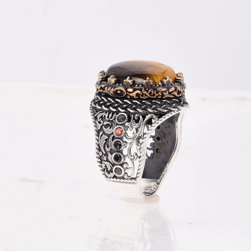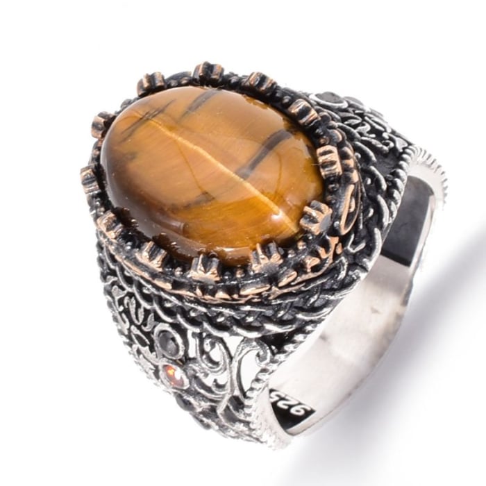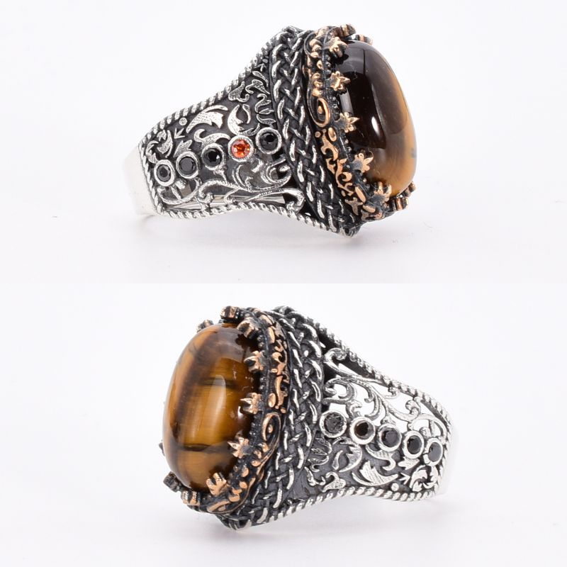 Piatra centrală, un ochi de tigru cu tăietură cabochon ovală, captează și reflectă lumina într-un mod unic, evocând energia și vitalitatea soarelui. Fiecare detaliu inspirat din arta tradițională islamică este lucrat manual cu migală, de la gravarea simbolurilor până la finisarea monturii.