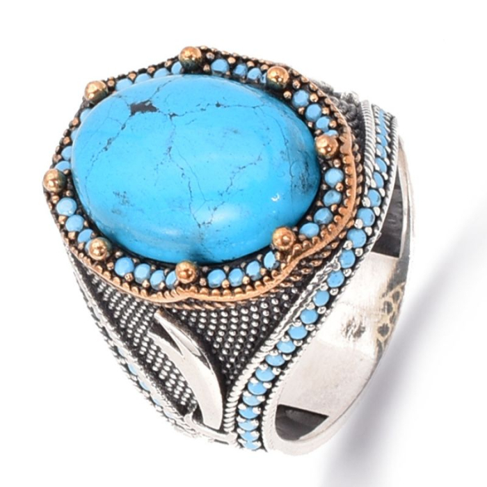 Descoperă eleganța atemporală a acestui inel din argint cu turcoaz natural pentru bărbați, inspirat din rafinamentul artei orientale.