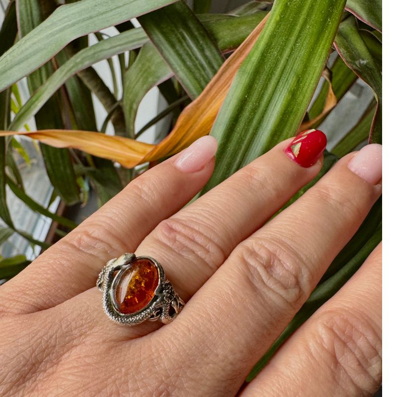 • Inelul din argint 925 cu chihlimbar „Șarpe și Flori” îmbină simbolismul intens al șarpelui cu finețea elementelor florale, într-un design expresiv și echilibrat.