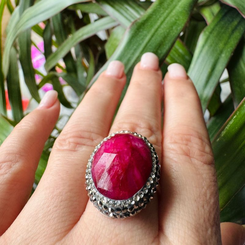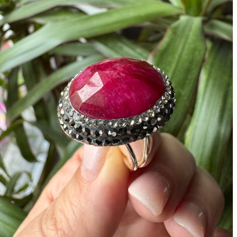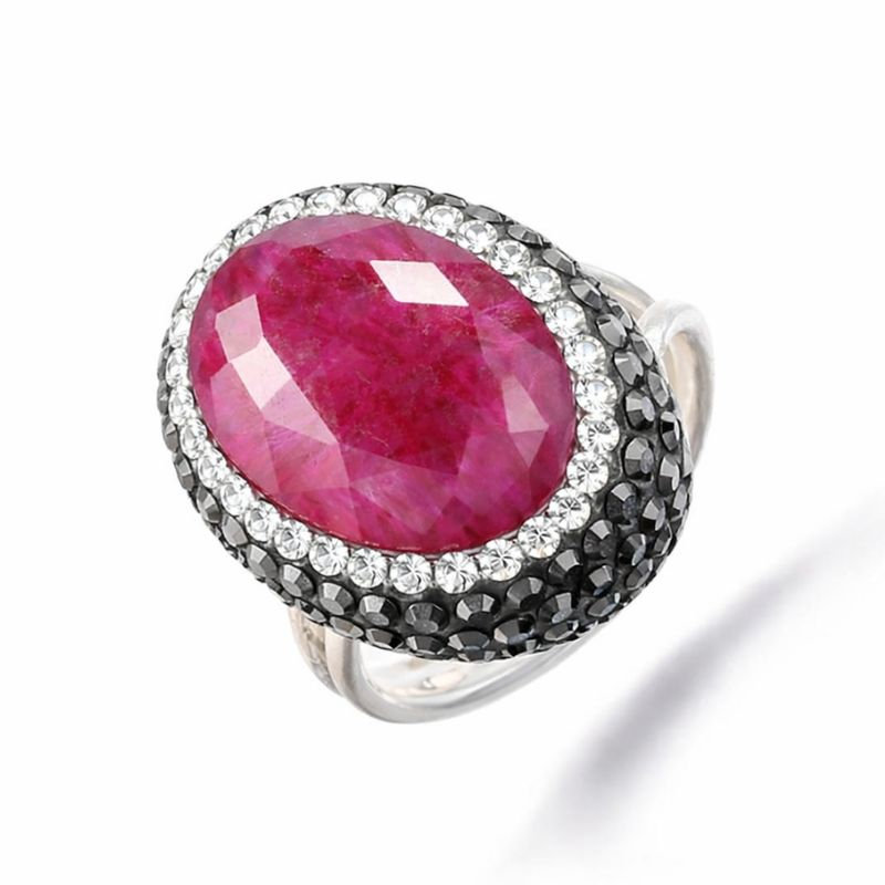Inel argint reglabil placat cu rodiu, ornat cu rubin fațetat, cubic zirconia albe si hematit. Inelul poate fi reglat pe circumferințe ale degetului cuprinse între 54-60 mm (17-19 mm diametrul).