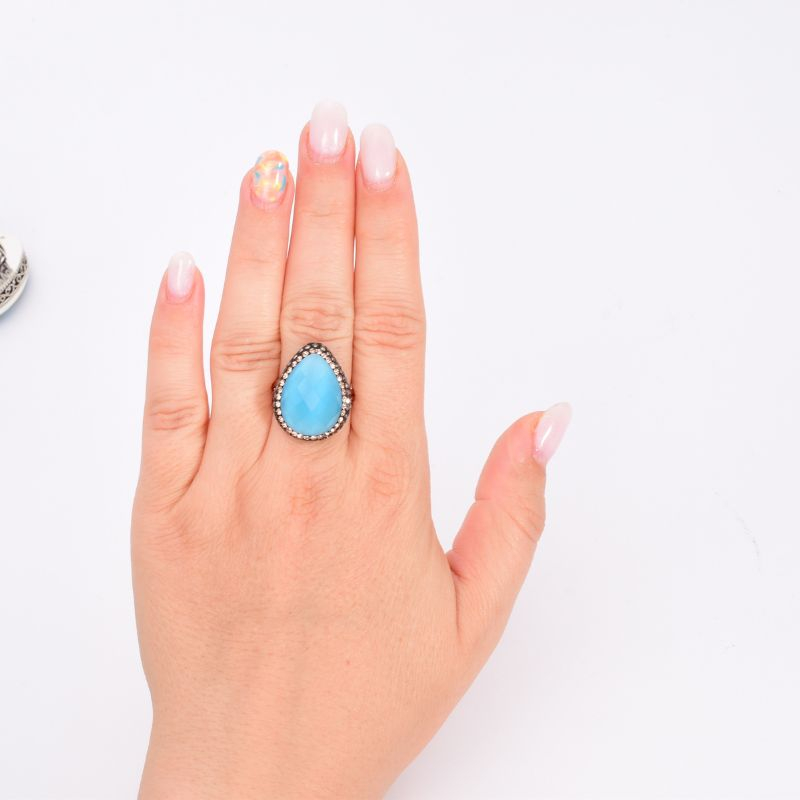- Inel de argint reglabil ornat cu pietre semiprețioase de sinteză ochi de pisică de culoare albastră, cubic zirconia și hematit.