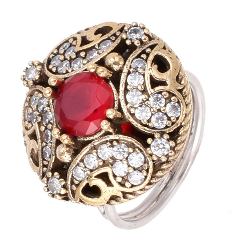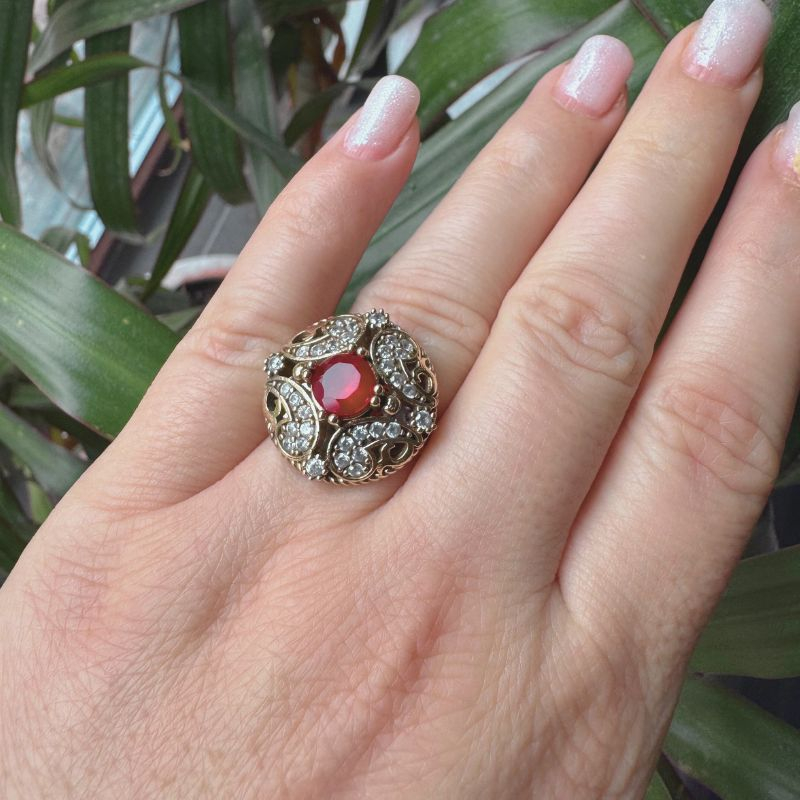 - Acest inel din argint reglabil cu aer regal impresionează prin eleganța sa inspirată din bijuteriile orientale. Piatra centrala, o cubic zirconia roșie, este acompaniată de o mulțime de diamante simulate CZ albe, strălucitoare.