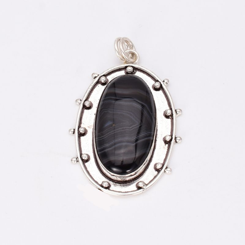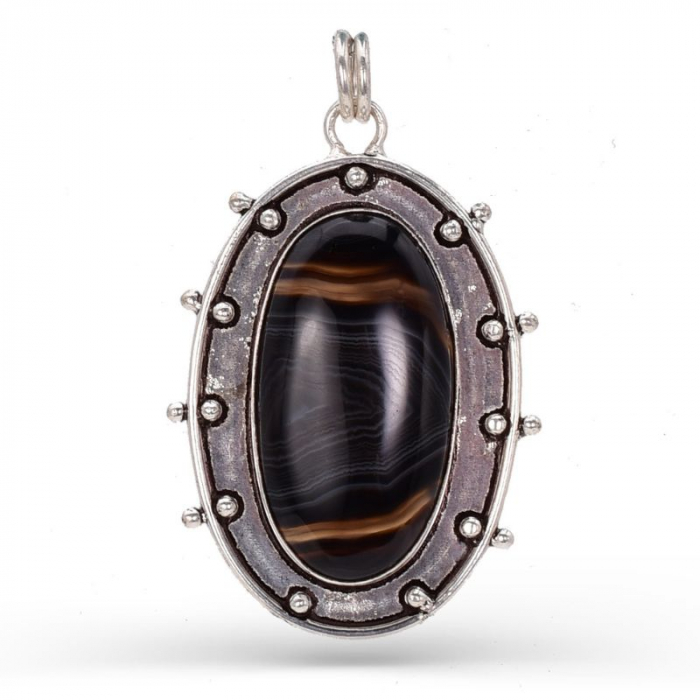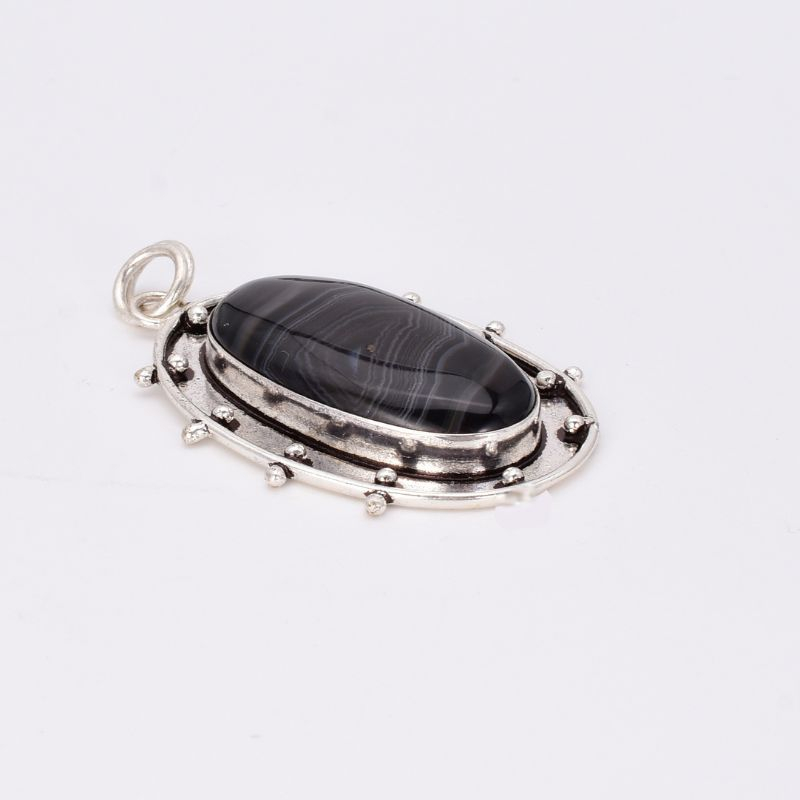 Montat în argint 925, cu detalii lucrate manual care pun în valoare unicitatea pietrei, pandantivul emană sobrietate, mister și eleganță discretă. Sardonixul negru, cu dungile sale naturale în nuanțe de gri, alb sau caramel, adaugă profunzime vizuală și un aer sofisticat.