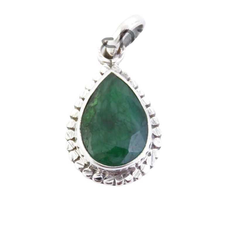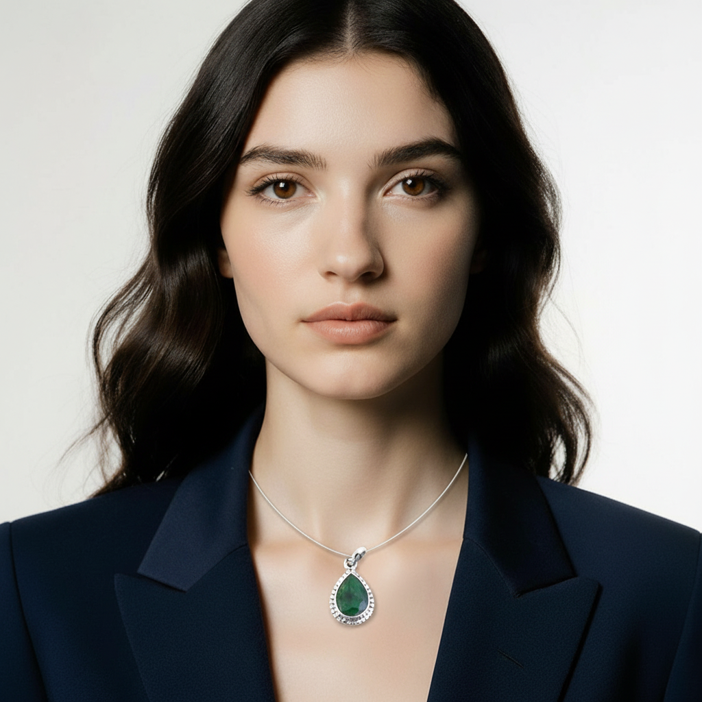 Acest pandantiv din argint cu smarald în formă de pară are un design clasic, rafinat, care scoate în evidență nuanța intensă de verde a pietrei.
