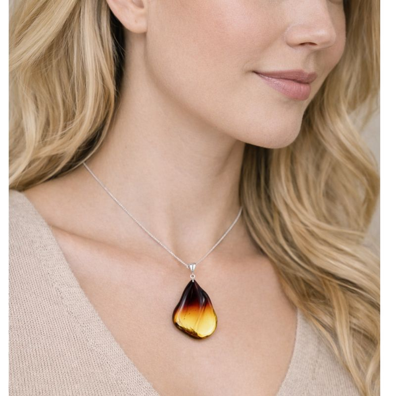 Realizat din argint și pus în valoare de chihlimbar baltic, fiecare piesă este unică, păstrând forma naturală și autenticitatea materialului. Dimensiunea generoasă îl transformă într-un pandantiv statement, perfect pentru ținute minimaliste care au nevoie de un accent sofisticat.