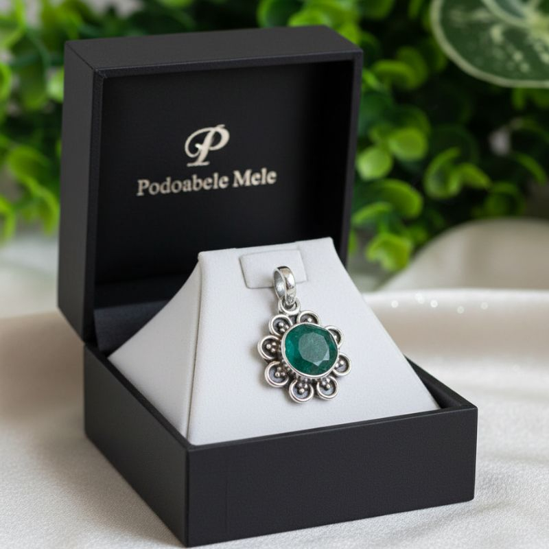 Acest pandantiv cu smarald din argint 925 este o piesă de bijuterie realizată manual, care îmbină rafinamentul naturii cu măiestria tradițională indiană. Designul floral delicat pune în valoare piatra centrală, transformând pandantivul într-un accesoriu elegant, cu personalitate distinctă.