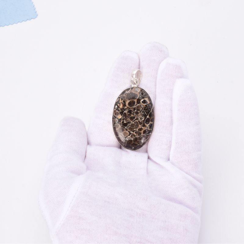 Un pandantiv de colecție, realizat manual din argint masiv, care pune în valoare o piesă spectaculoasă de agat Turritella.