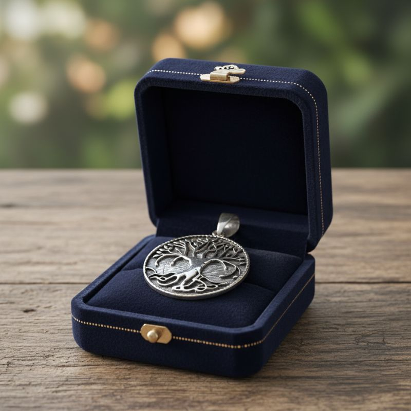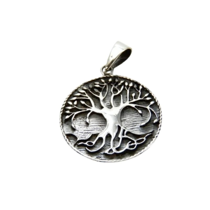 Pandantivul din argint cu simbolul Pomului Vieții realizat in India, cu diametrul de 23 mm.