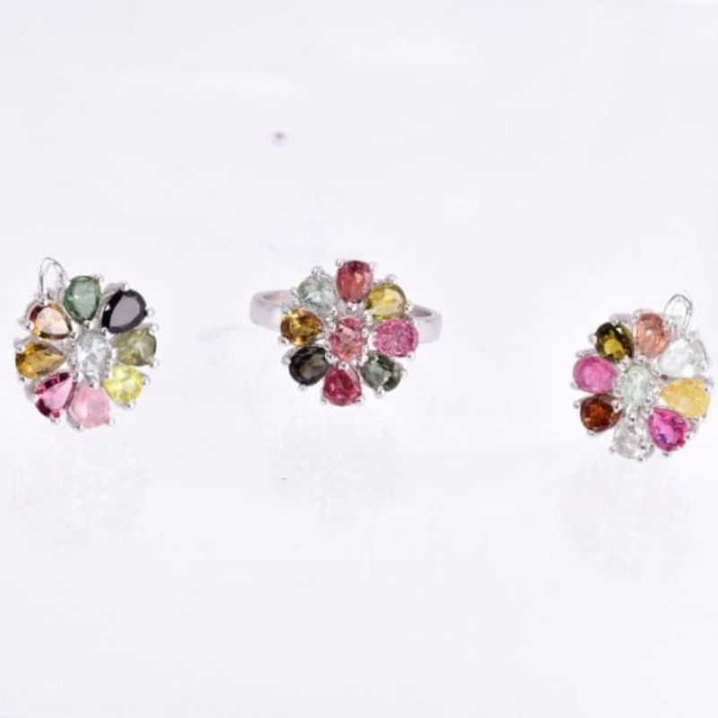 • Set argint 925 elegant cu pietre semipretioase multicolore de turmalină, dispuse sub forma de petale de flori.
