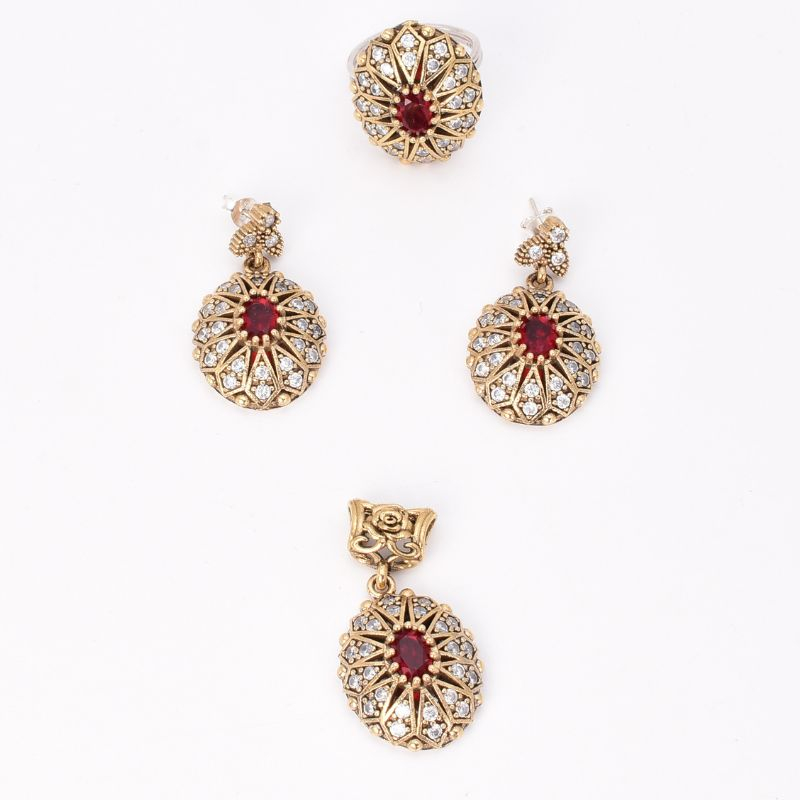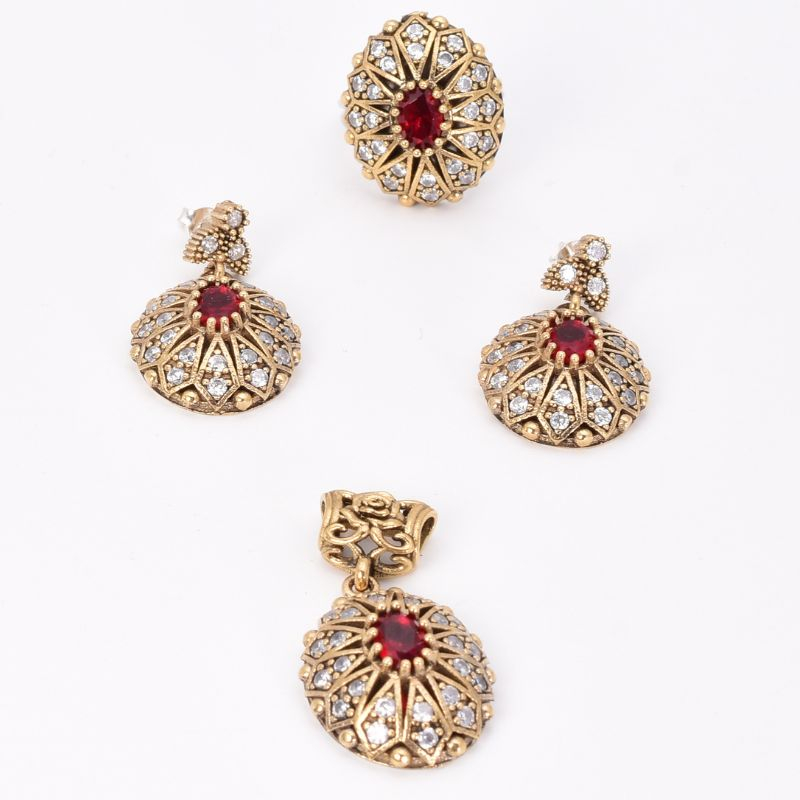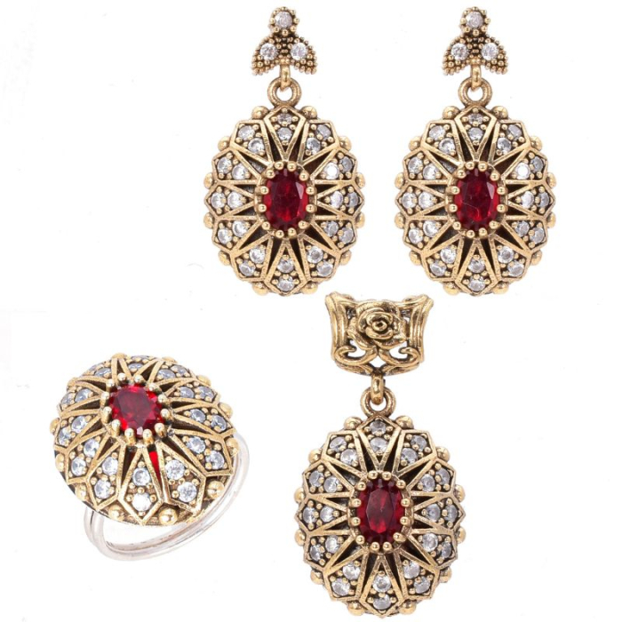 - Inspirat din eleganța bogată a bijuteriilor orientale, acest set din argint în stil otoman, cu design oval, impresionează prin combinația intensă de cubic zirconia roșii și albe. Contrastul dintre roșul profund și strălucirea pietrelor albe creează un efect vizual spectaculos, cu aer regal și feminin