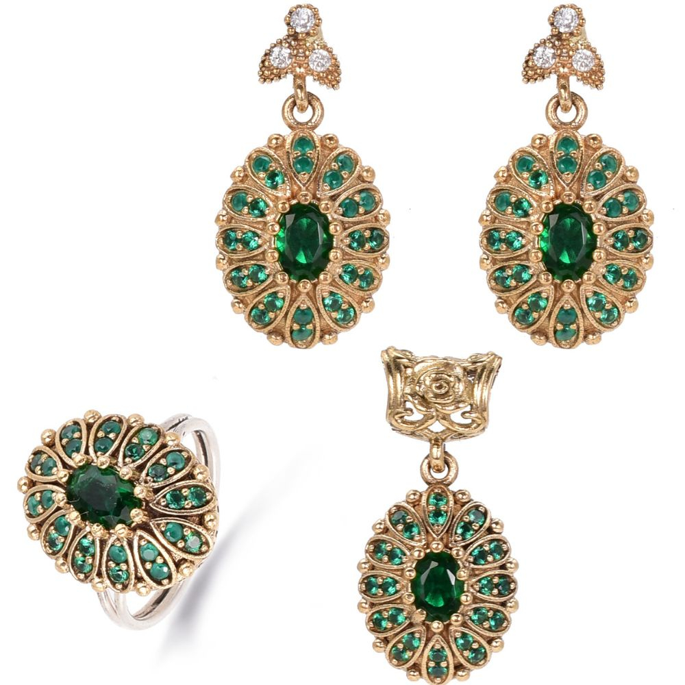 - Set de argint elegant in stil otoman, forma ovală, cu pietre CZ verzi si accente din bronz. Setul este format din: cercei, pandantiv (fara lant), inel reglabil.
