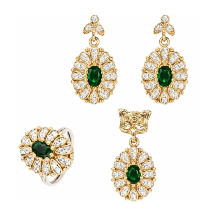 - Rafinamentul oriental și eleganța regală se îmbină armonios în acest set din argint, realizat în stil otoman. Cubic zirconia verde, intens și luminos, este pus în valoare de strălucirea delicată a CZ-urilor albe, creând un contrast sofisticat și feminin.