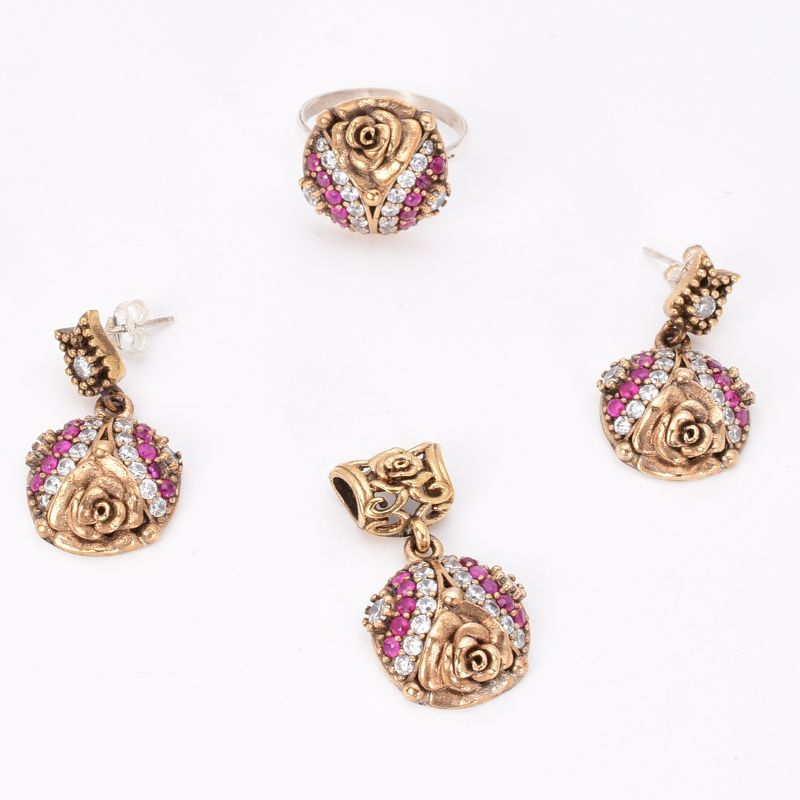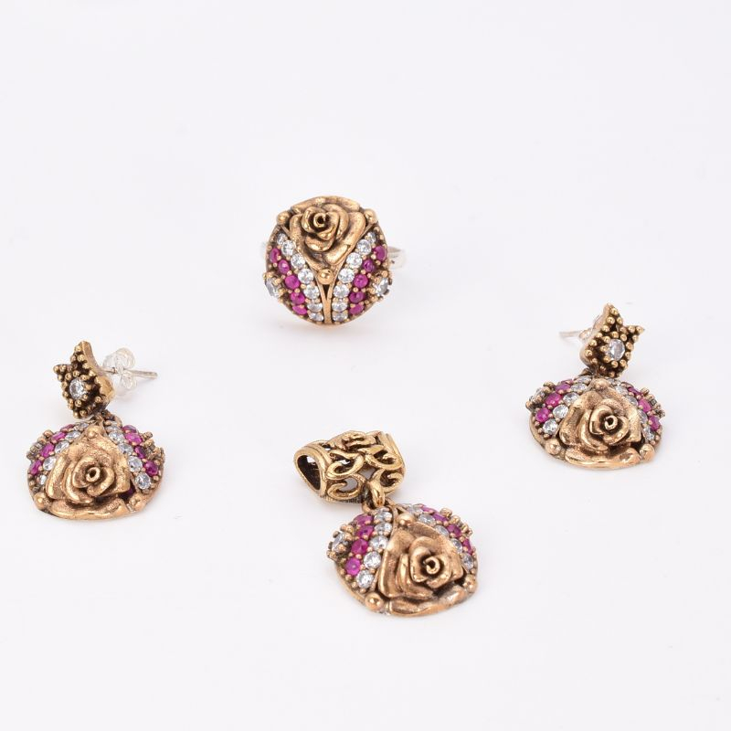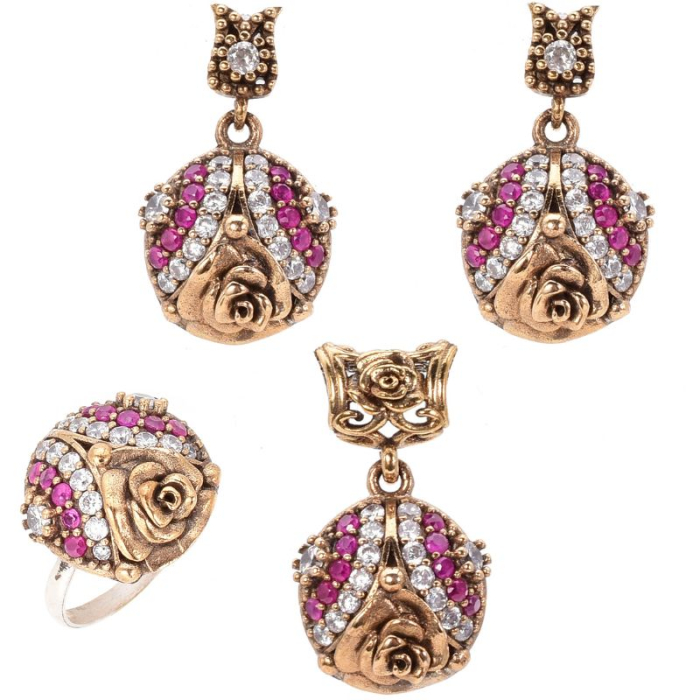 - Inspirat din frumusețea florii de trandafir și bogăția detaliilor orientale, acest set din argint 925 placat cu rodiu impresionează prin eleganță și expresivitate. Pietrele cubic zirconia roșii, intense și pasionale, sunt puse în valoare de strălucirea fină a CZ-urilor albe, creând un contrast sofisticat, cu aer regal.