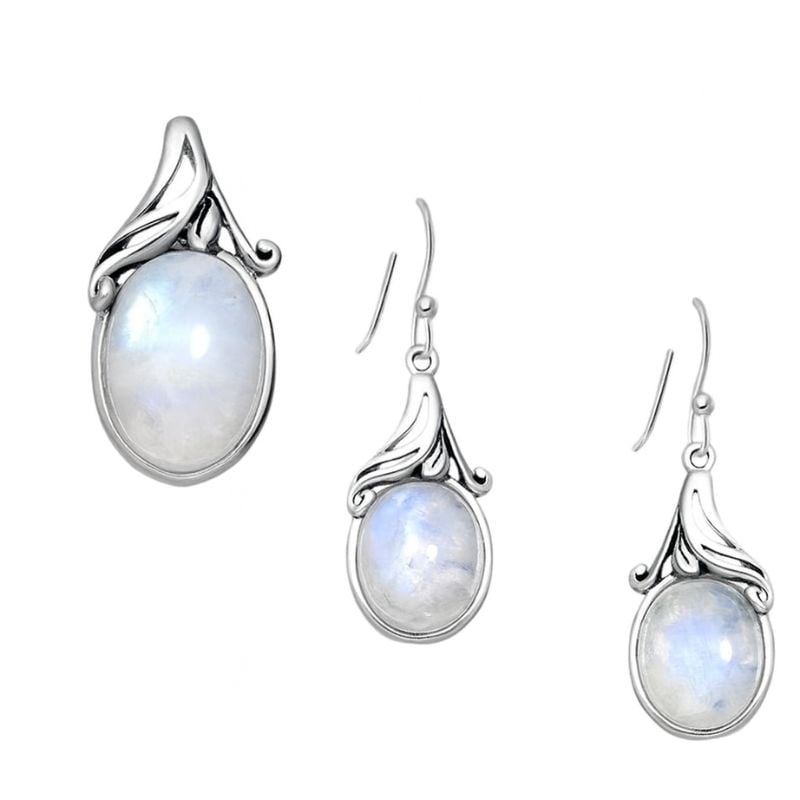 Setul cu piatra lunii (cercei, pandantiv, fără lanț) combină eleganța argintului cu irizațiile delicate ale pietrei selenare.